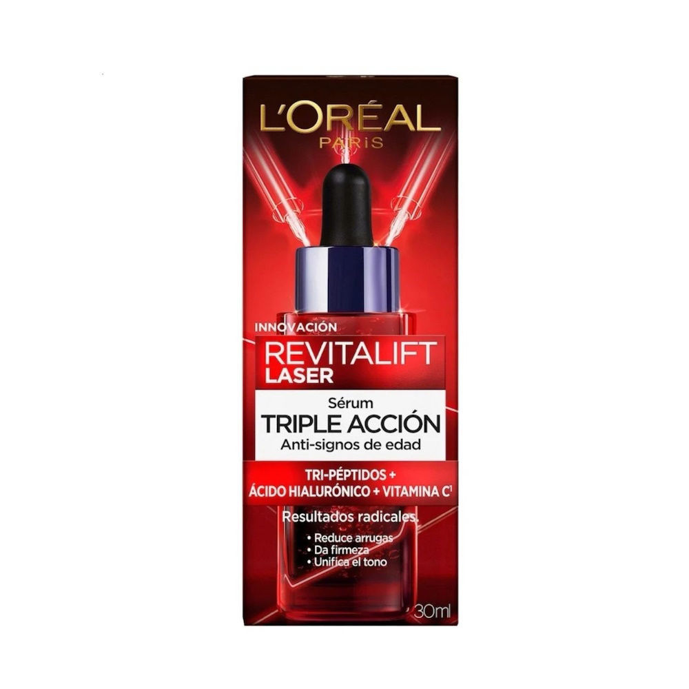 El Sérum Tri-péptidos Corrector Anti-Edad Revitalift Laser de L´Oréal combina 3 Top Dermo-activos anti-edad: Péptidos, Ácido Hialurónico y Vitamina Cg para reducir arrugas, reafirmar e iluminar la piel. Aplicar por la mañana y por la noche, solo o antes de la crema Revitalift Laser, sobre la piel limpia con movimientos ascendentes.
