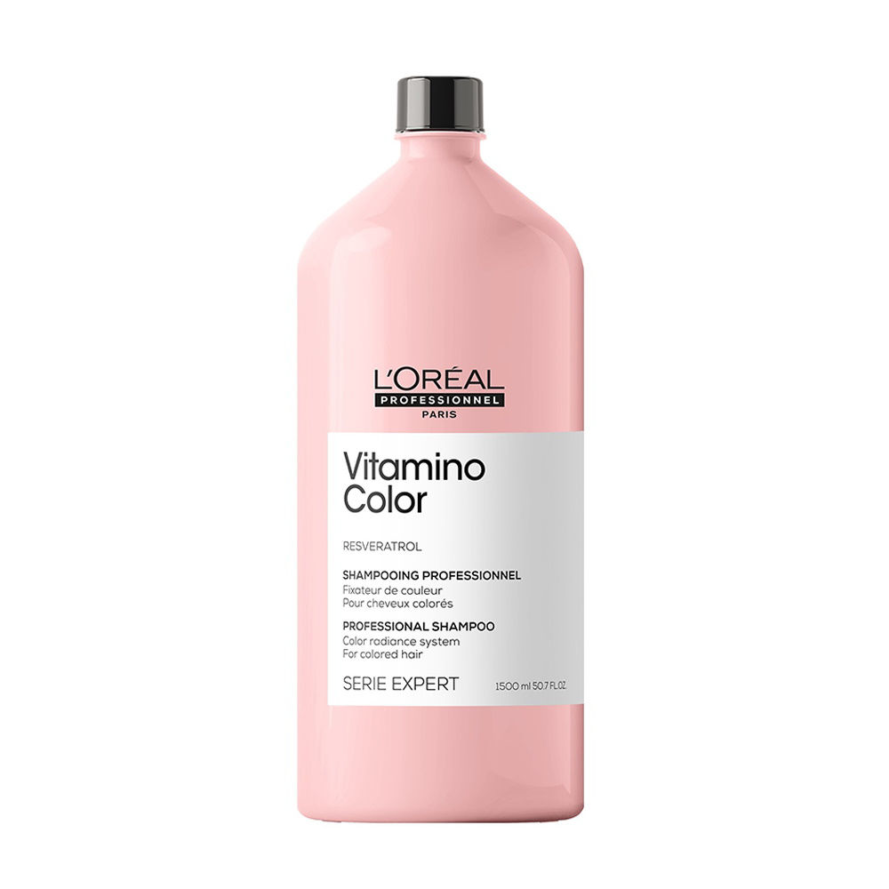 Shampoo profesional Vitamino Color para un cabello coloreado, suave y purificado. Enriquecido con Resveratrol y con una tecnología co-emulsionada, elimina los residuos protegiendo el cabello y la luminosidad del color.